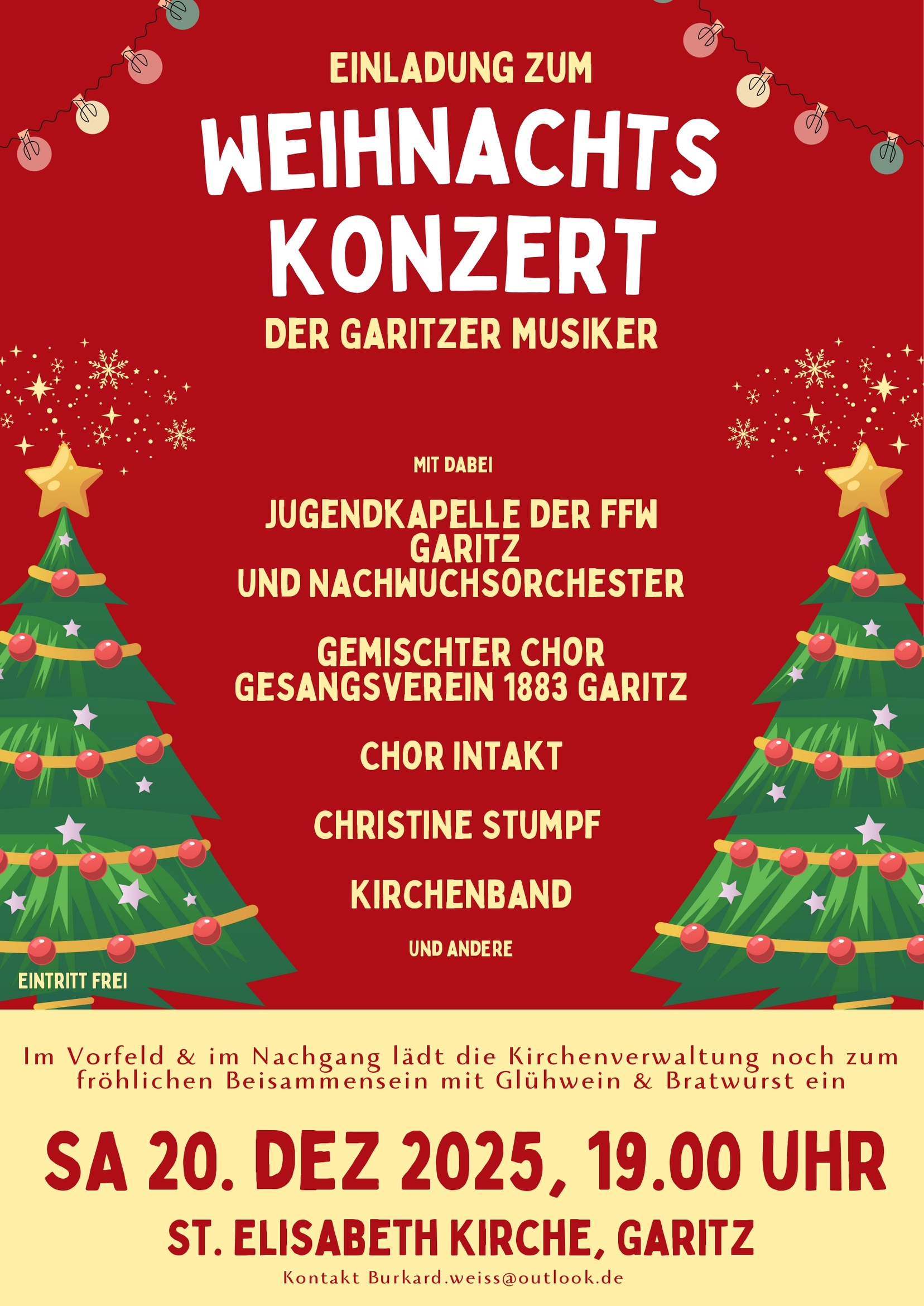 Im Vorfeld & im Nachklang lädt die Kirchenverwaltung noch zum fröhlichen Beisammensein mit Glühwein und Bratwurst ein.