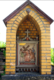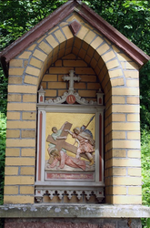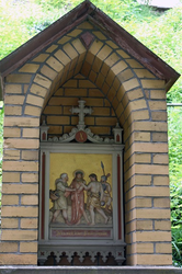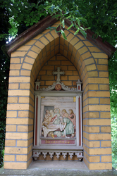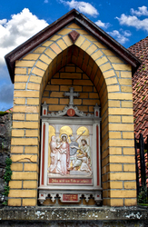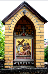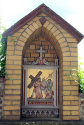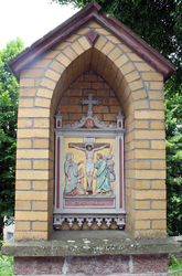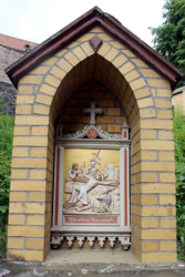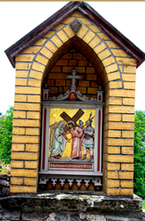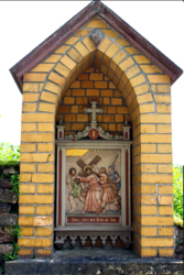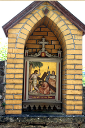 An der linken Außenwand werden auf vier Bildtafeln die Stationen des Kreuzwegs dargestellt. Je drei Stationen sind auf einer Bildtafel zusammengefasst.